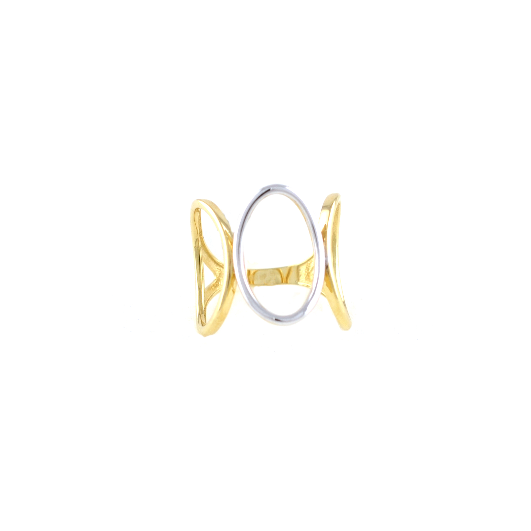 Δαχτυλίδι φαρδύ σε λευκό και κίτρινο χρυσό 14 καρατίων με διάτρητο γεωμετρικό σχέδιο.