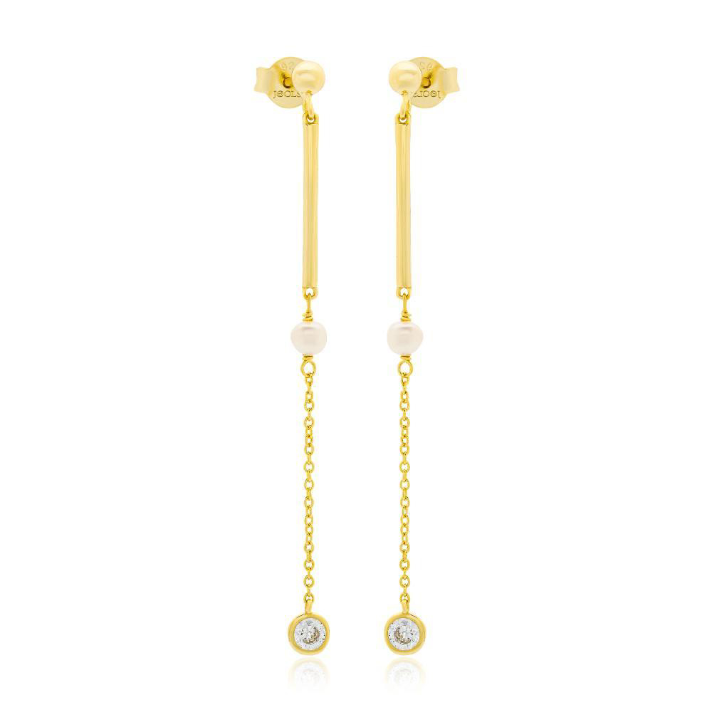 Σκουλαρίκια ασημένια επιχρυσωμένα με ζιργκόν πέτρες και πέρλες κρεμαστές.