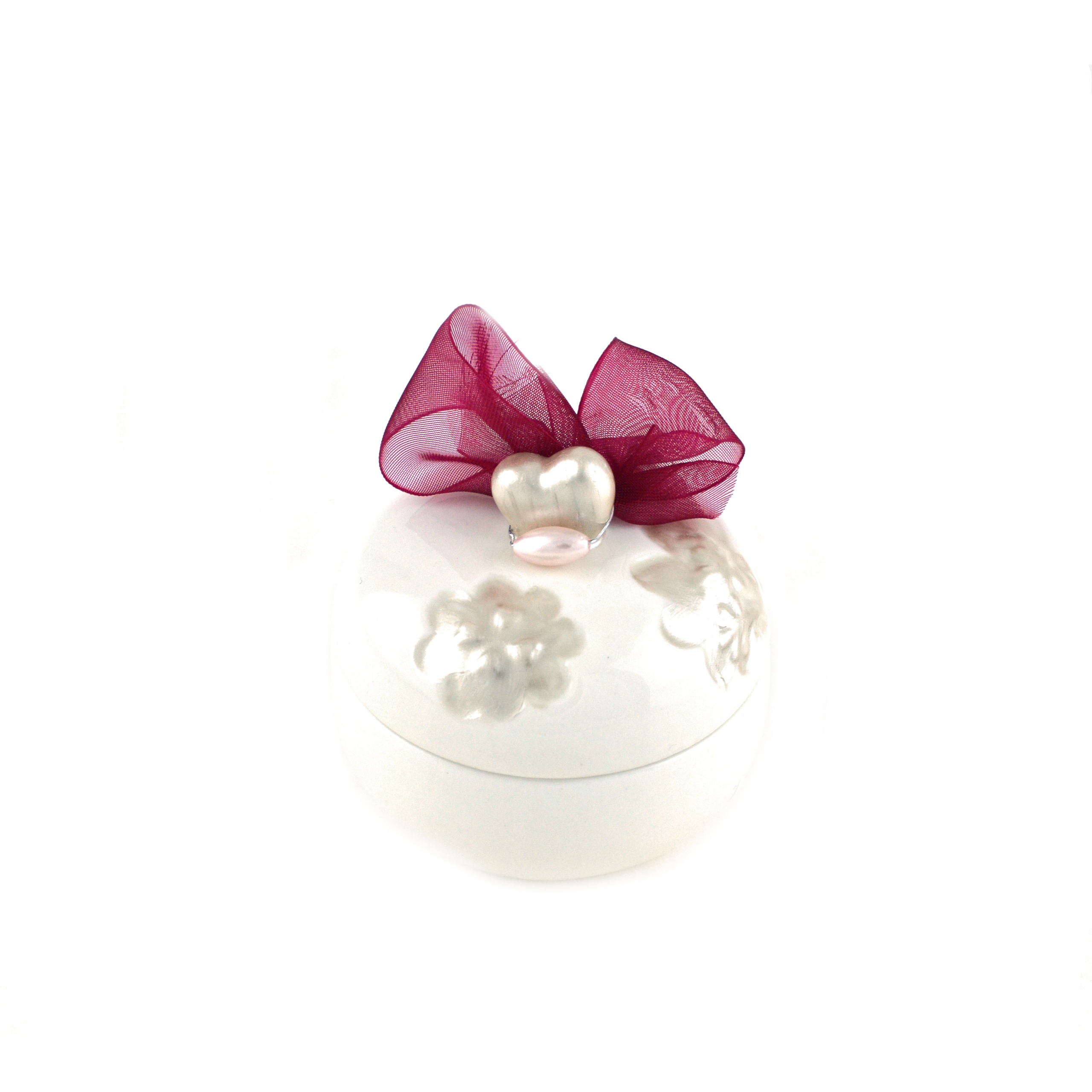 Μπομπονιέρα από 5 κουφέτα, πορσελάνινο κουτί με λουλούδια από χρυσή μπογιά και τούλι. Ενδεικτικό χρώμα κορδέλας που πεοσαρμόζεται σε ότι θέμα έχει ο στολισμός.