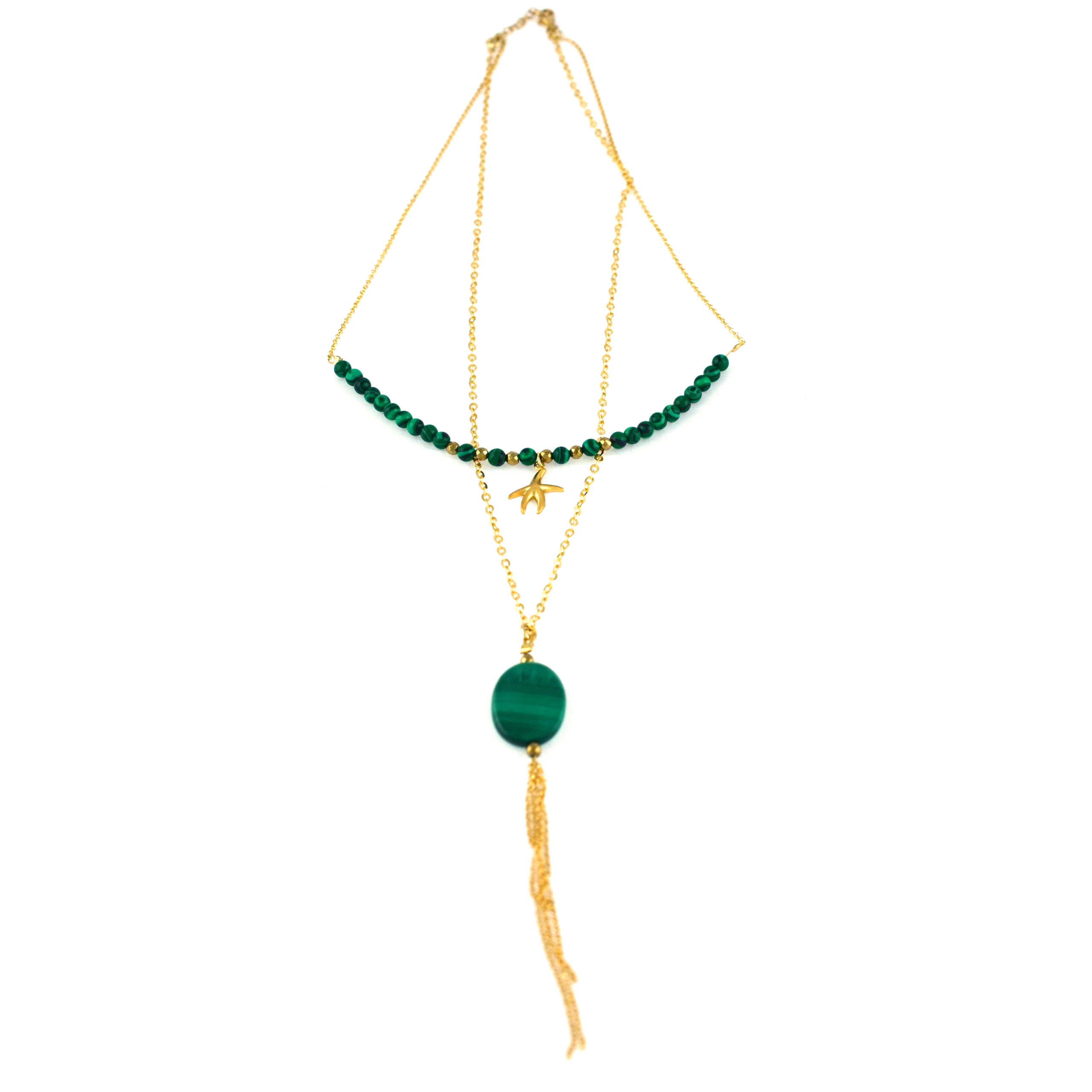 Κολιέ ασημένιο επιχρυσωμένο με διπλή σειρά από πέτρες μαλαχίτη.