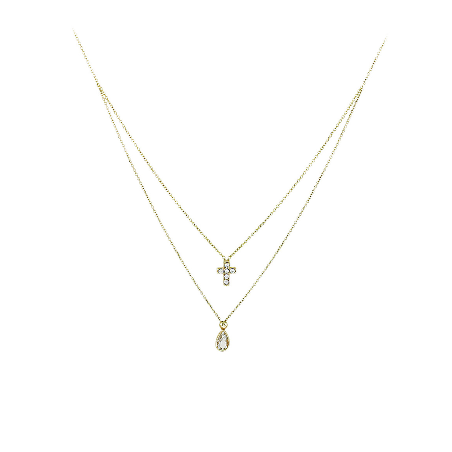 Κολιέ 14 καρατίων με διπλή αλυσίδα, μενταγιόν δάκρυ και σταυρού γεμάτο ζιργκόν πέτρες .