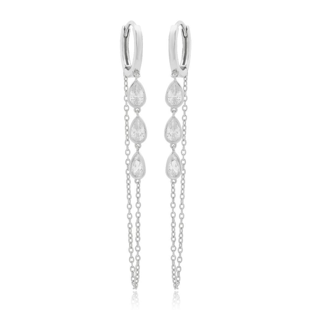 Σκουλαρίκια ασημένια σε σχέδιο κρίκων μεσσαίου μεγέθους με καρφωμένες ζιργκόν πέτρες πάνω σε κρεμαστή αλυσίδα.