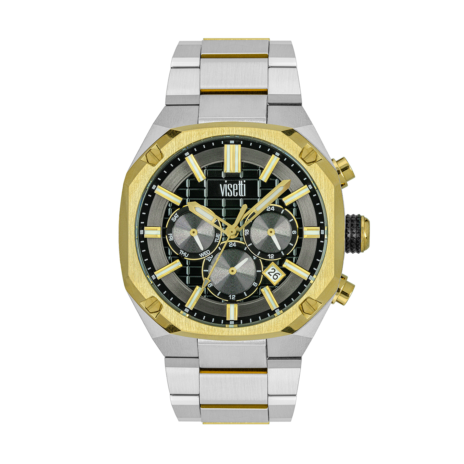 Ρολόι με ασημί και χρυσό μπρασελέ , αδιάβροχο στις 10 ατμ, τετράγωνη κάσα 43MM σε πράσινο χρώμα ,αναλογικός quartz μηχανισμός από ανοξείδωτο ατσάλι με δύο χρόνια εγγύηση.