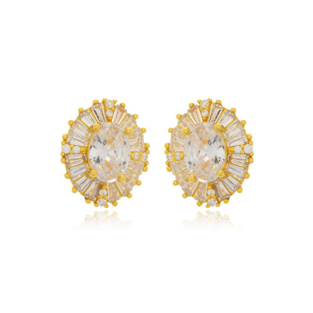 Σκουλαρίκια ασημένια επιχρυσωμένα σε σχέδιο ροζέτας μεσσαίου μεγέθους με ζιργκόν πέτρες καρφωμένες.