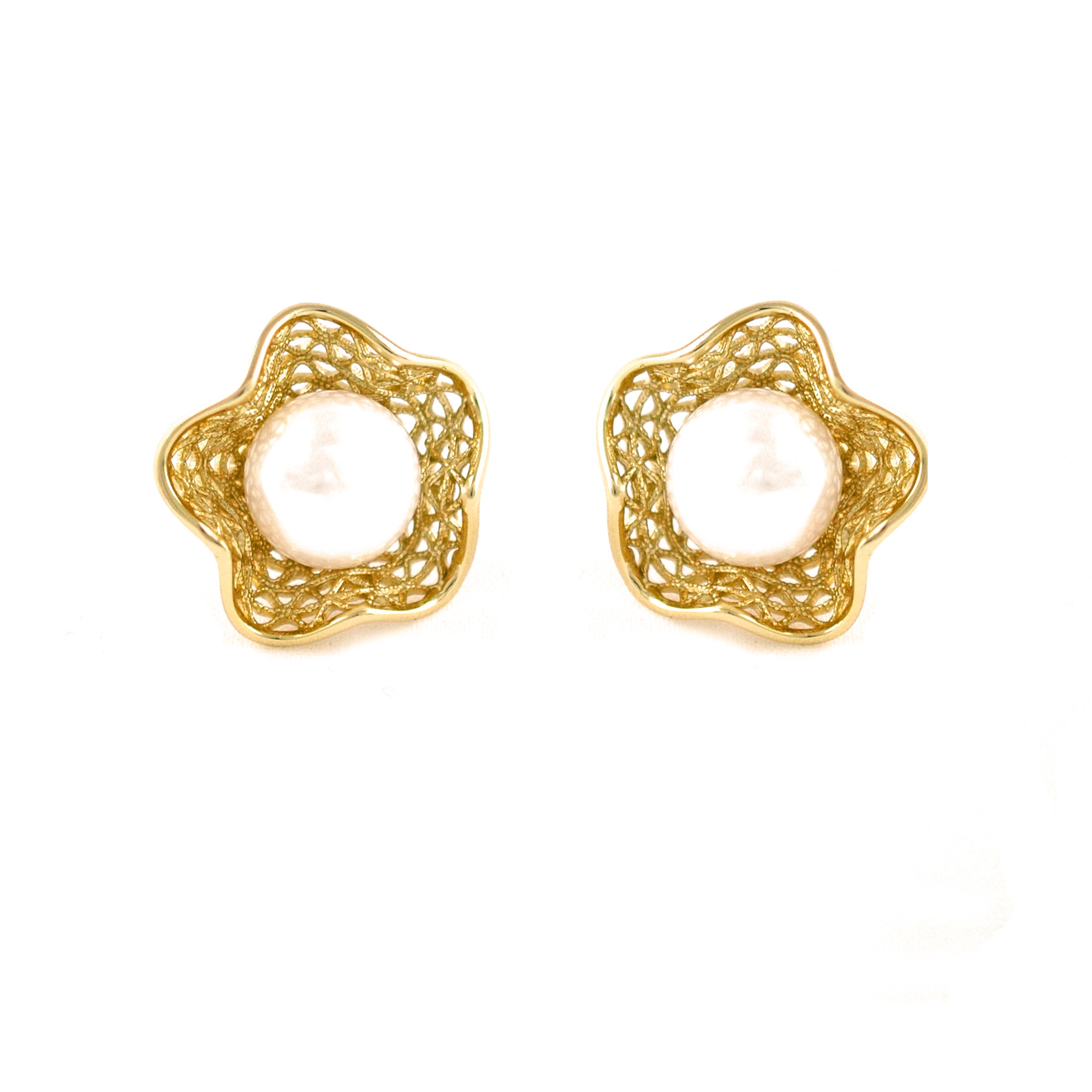 Σκουλαρίκια ασημένια επιχρυσωμένα με λουλούδι σχέδιο και στο κέντρο πέρλα.