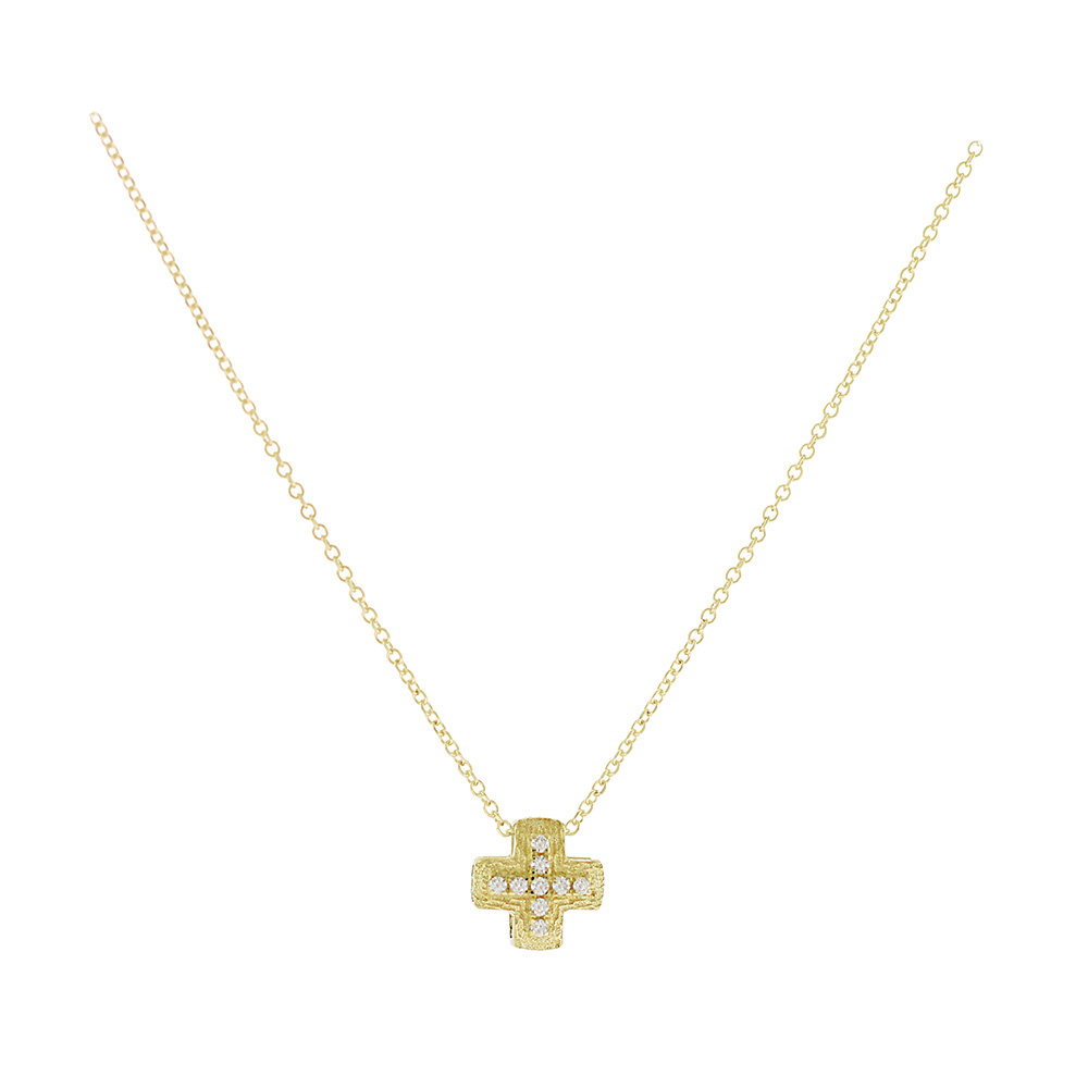 Κολιέ σε χρυσό 09 καρατίων με κρεμαστό σταυρό μικρού μεγέθους από ζιργκόν πέτρες.