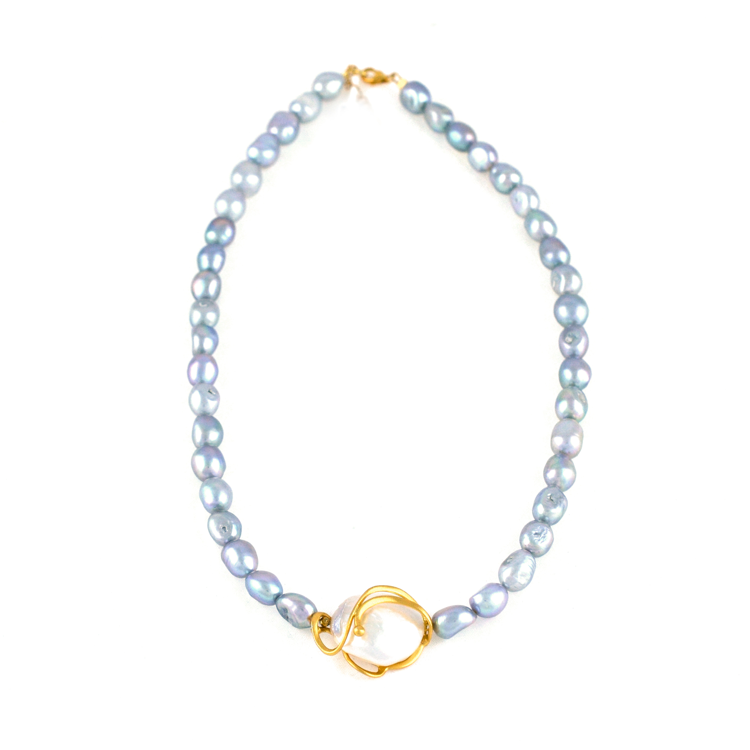 Κολιέ ασημένιο σε κίτρινο χρυσό χρώμα με γνήσια μαργαριτάρια γλυκού νερού γκρι απόχρωσης.