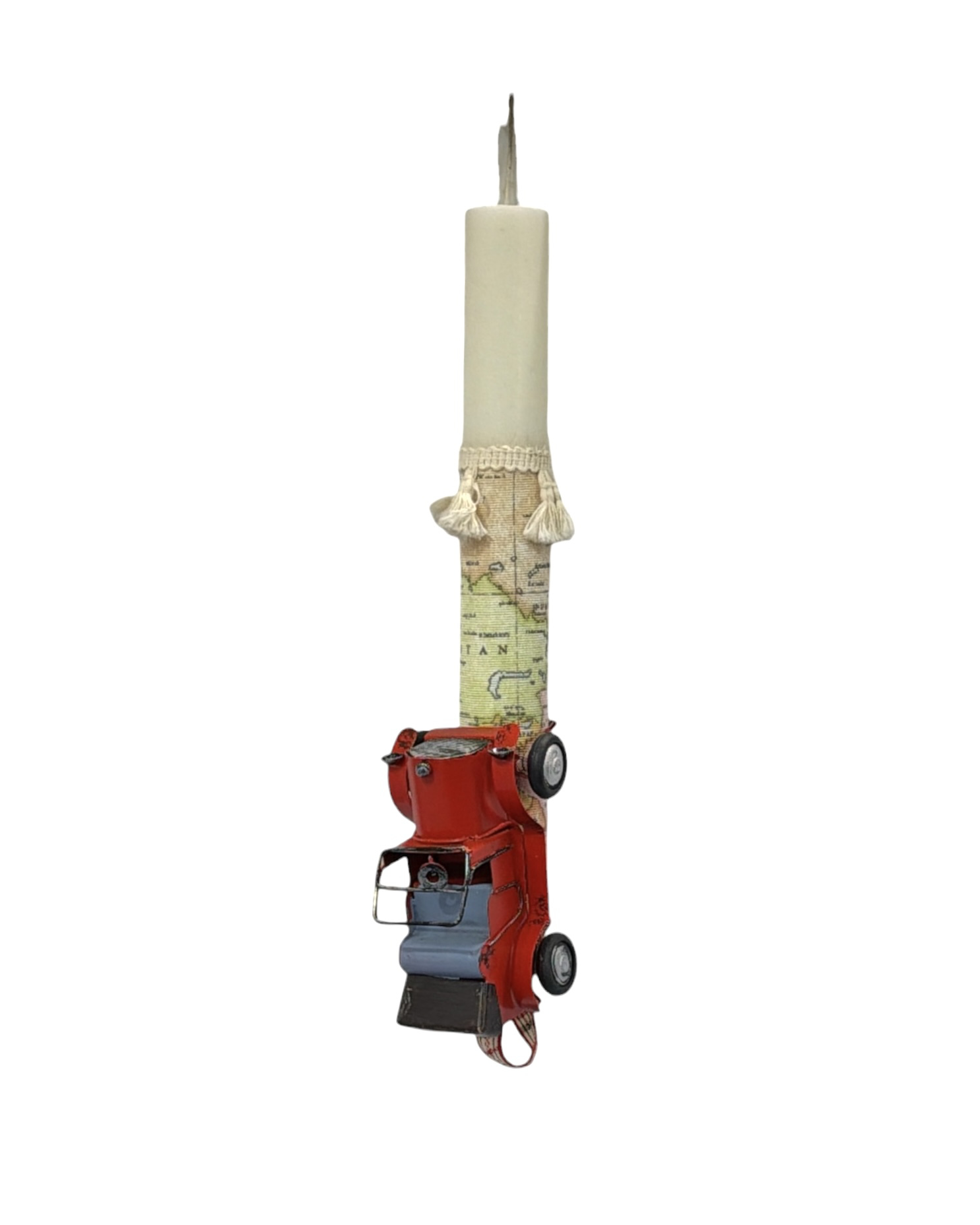 Λαμπάδα χειροποίητη λευκή στρογγυλεμένη με κορδέλες, συνδυασμένη με μεταλλικό διακοσμητικό αμάξι.