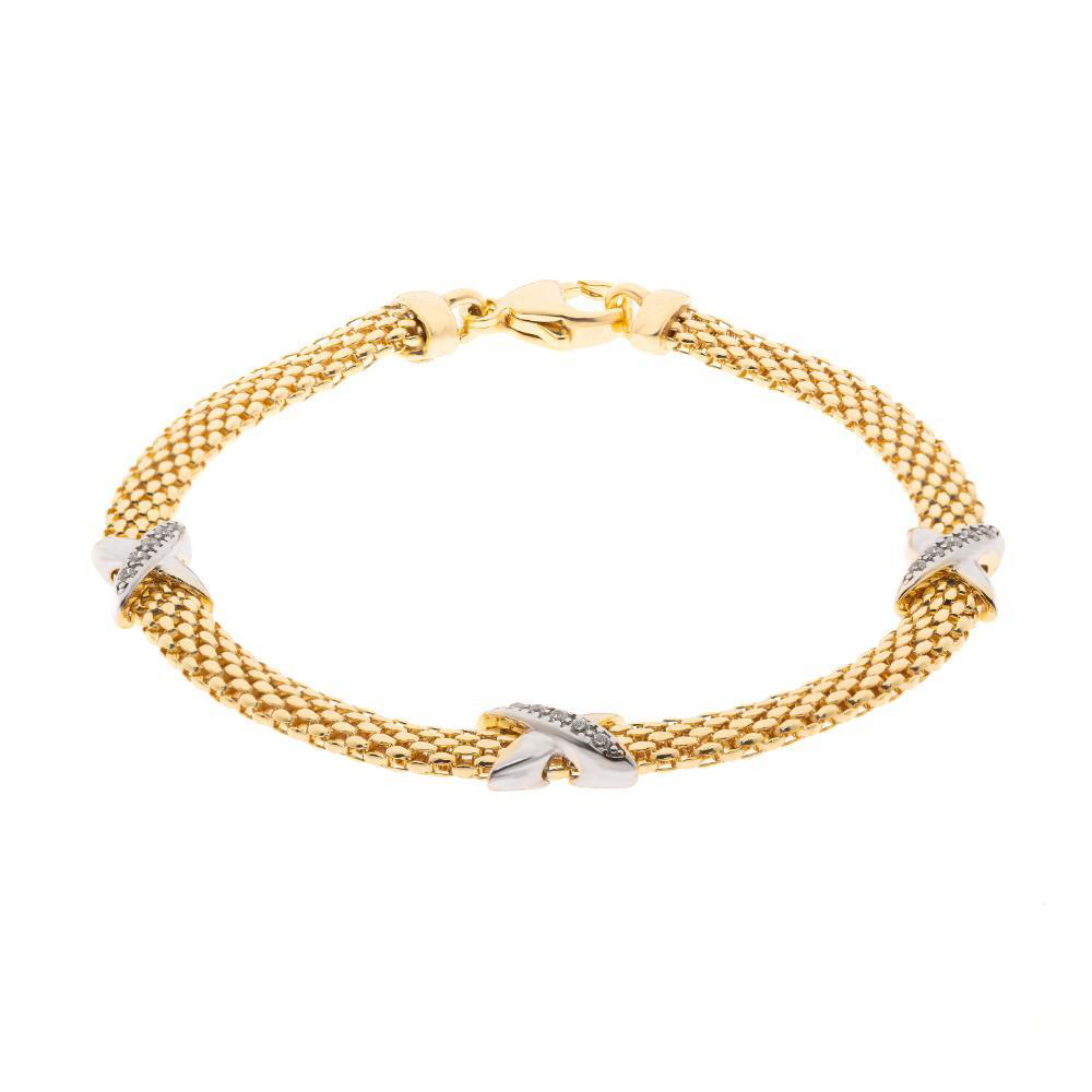 Βραχιόλι ασημένιο επιχρυσωμένο σαν χειροπέδα με σχέδιο φαρδιάς αλυσίδας και χ σχημάτων από ζιργκόν πέτρες.