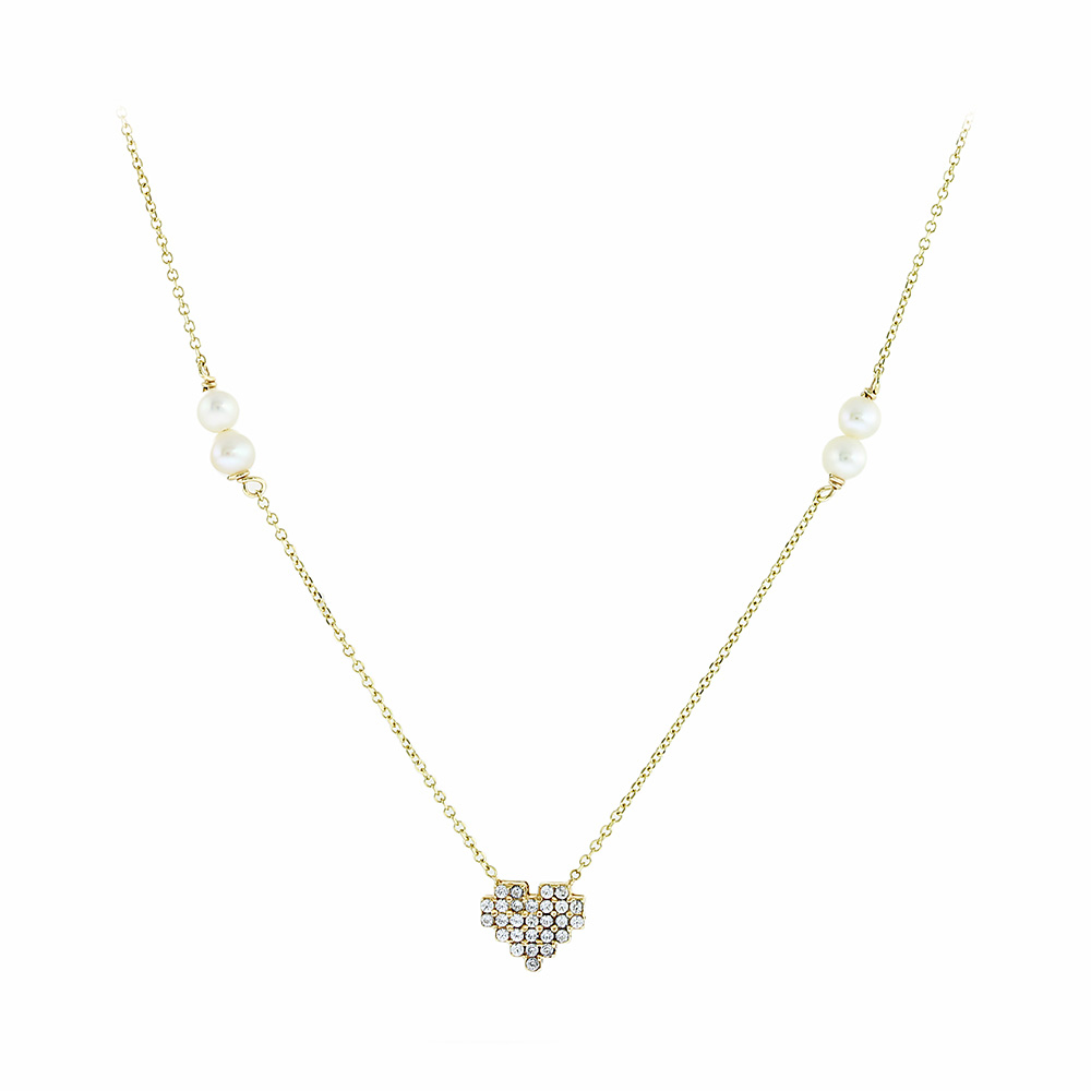 Κολιέ 09 καρατίων σε κίτρινο χρώμα με περασμένα μαργαριτάρια γλυκού νερού και κεντρική καρδιά από ζιργκόν πέτρες.