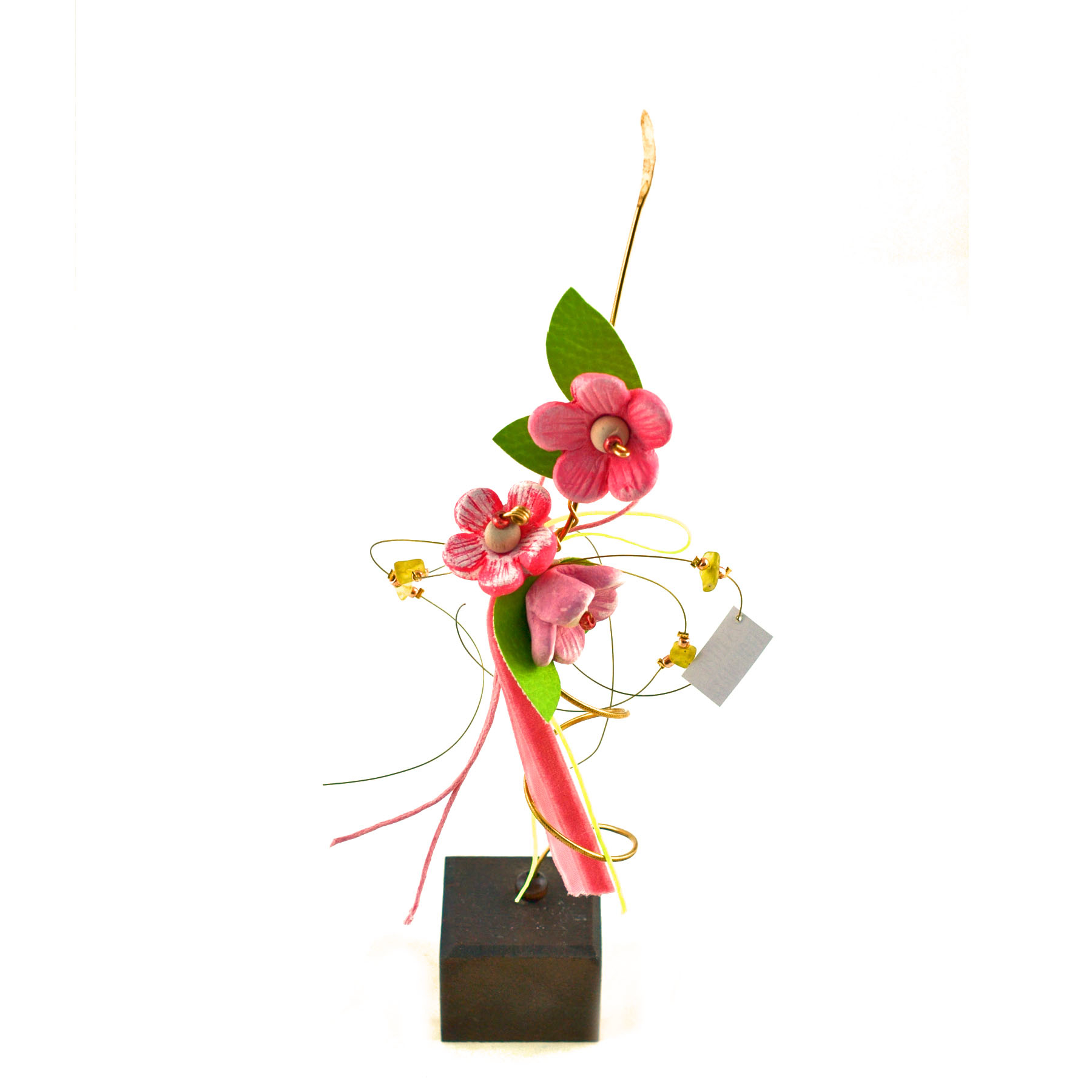 Διακοσμητικό χειροποίητο από σύρματα και λουλούδια πήλινα σε ροζ χρώμα πάνω σε ξύλινη βάση.