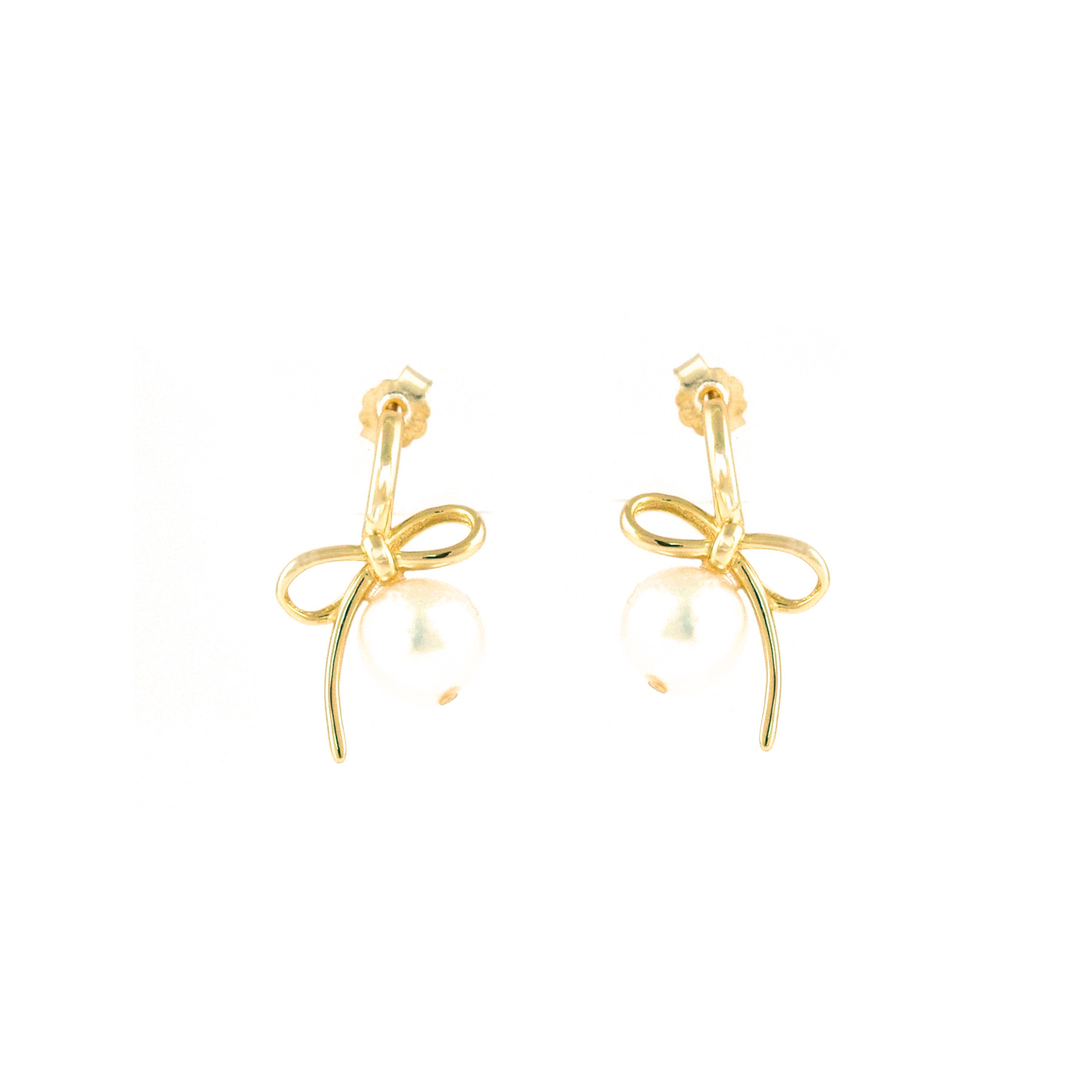 Σκουλαρίκια ασημένια επιχρυσωμένα κρεμαστά με μέταλλο σαν κορδέλα και μαργαριτάρι.