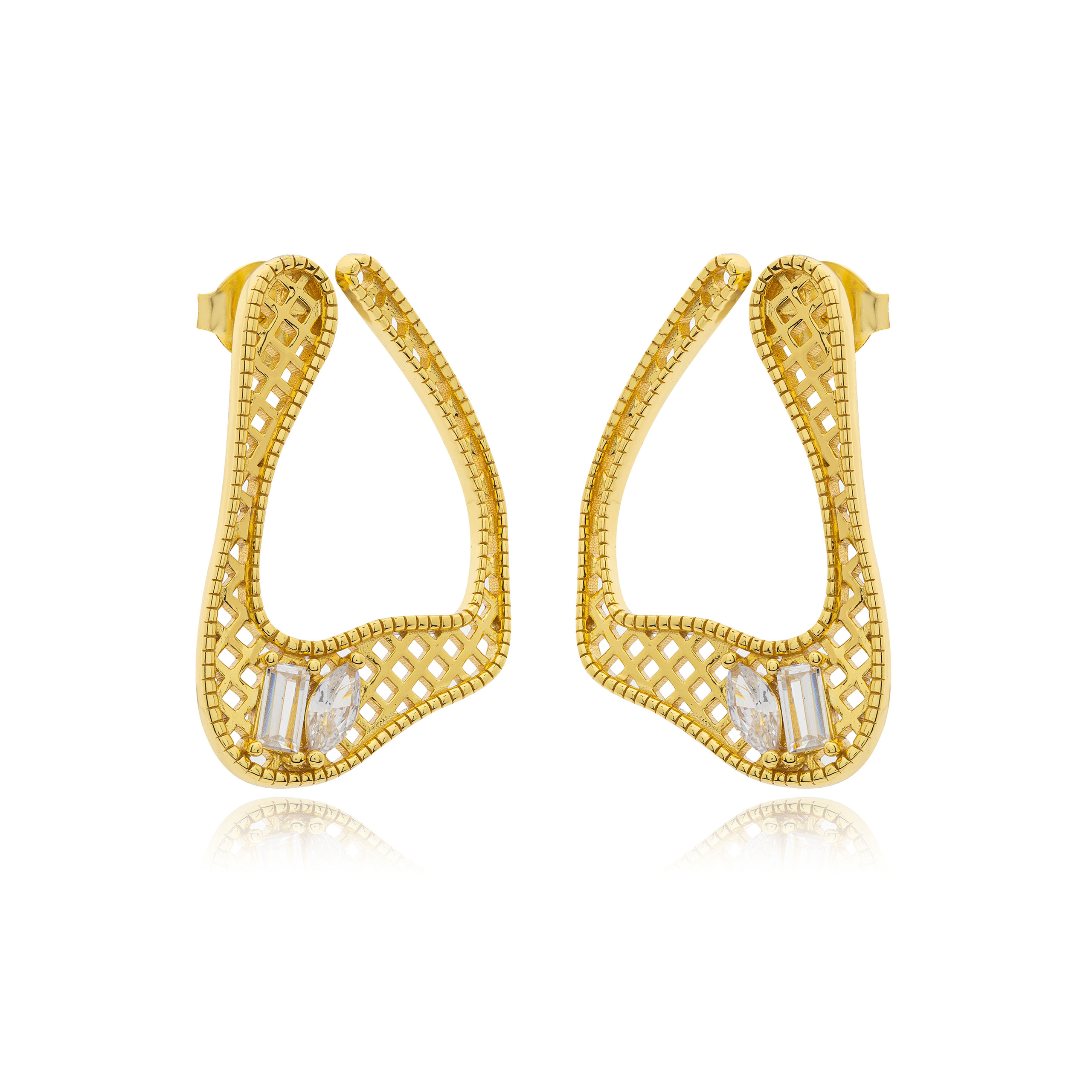 Σκουλαρίκια ασημένια επιχρυσωμένα σε σχέδιο εντυπωσιακού μεγέθους με ζιργκόν πέτρες καρφωμένες.