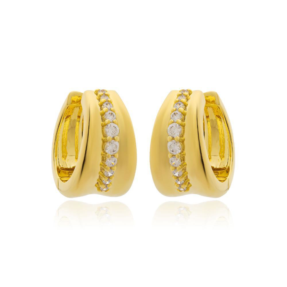 Σκουλαρίκια ασημένια επιχρυσωμένα σε σχέδιο κρίκων μεσσαίου μεγέθους με ζιργκόν πέτρες καρφωμένες.