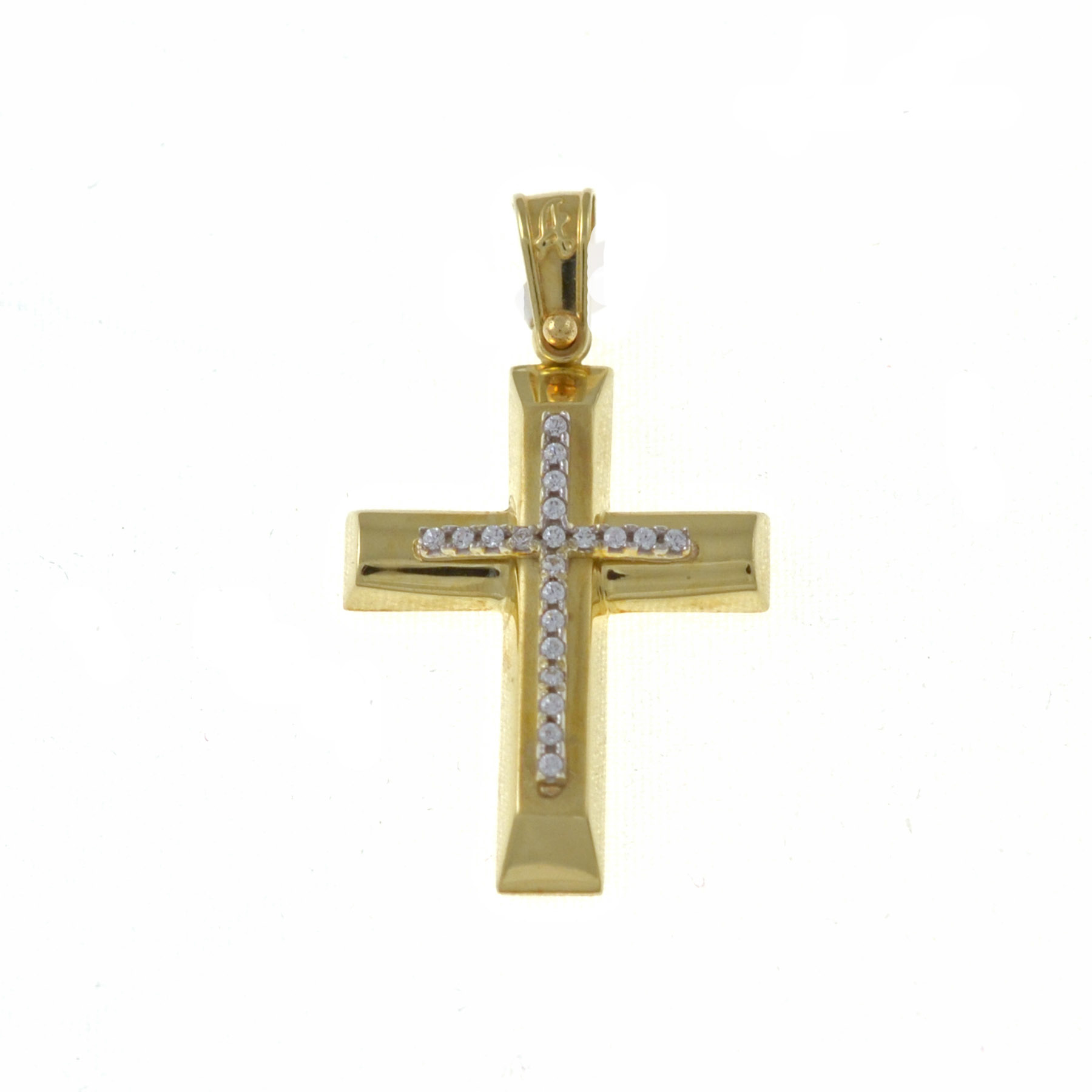 Σταυρός χρυσός 14 καρατίων σε μεσαίο μέγεθος. Κλασικό σχέδιο σταυρού σε συνδυασμό ματ όψης στον κάθετο άξονα και γυαλιστερής στον οριζόντιο μαζί με ζιργκόν πέτρες.