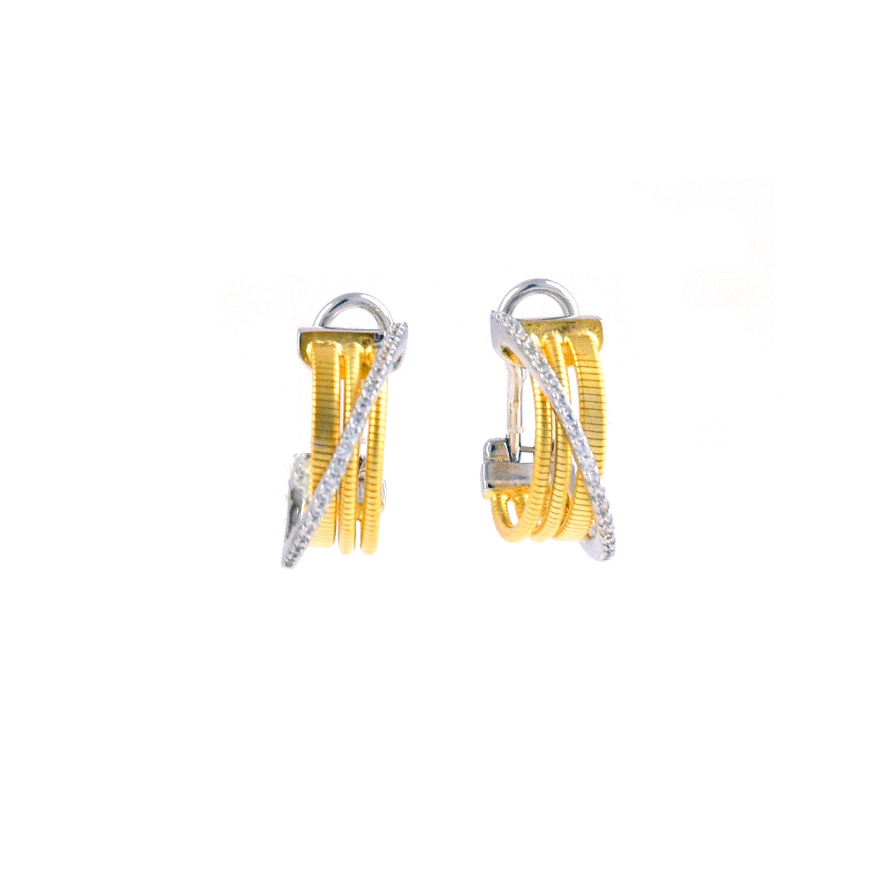 Σκουλαρίκια ασημένια επιχρυσωμένα σε σχέδιο κρίκου μεσσαίου μεγέθους με ασημί γραμμή με ζιργκόν πέτρες.