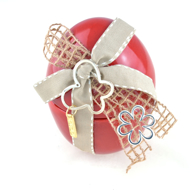 Διακοσμητικό αυγό σε μεγάλο μέγεθος. Χειροποίητο από κεραμικό υλικό βαμμένο σε κόκκινο χρώμα με κορδέλες και μεταλλικά μοτίφ.